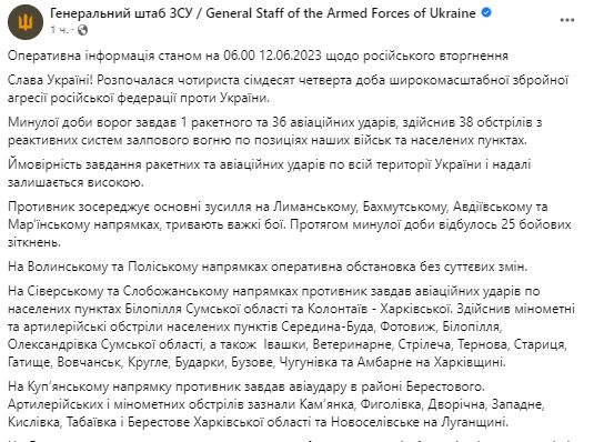 В понедельник, 12 июня, Генштаб ВСУ обнародовал сводку о ситуации на фронте.
