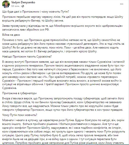 Руководитель "Украинского института будущего" Вадим Денисенко проанализировал конфликт главы Минобороны РФ Сергея Шойгу и куратора наемников из ЧВК "Вагнер" Евгения Пригожина.