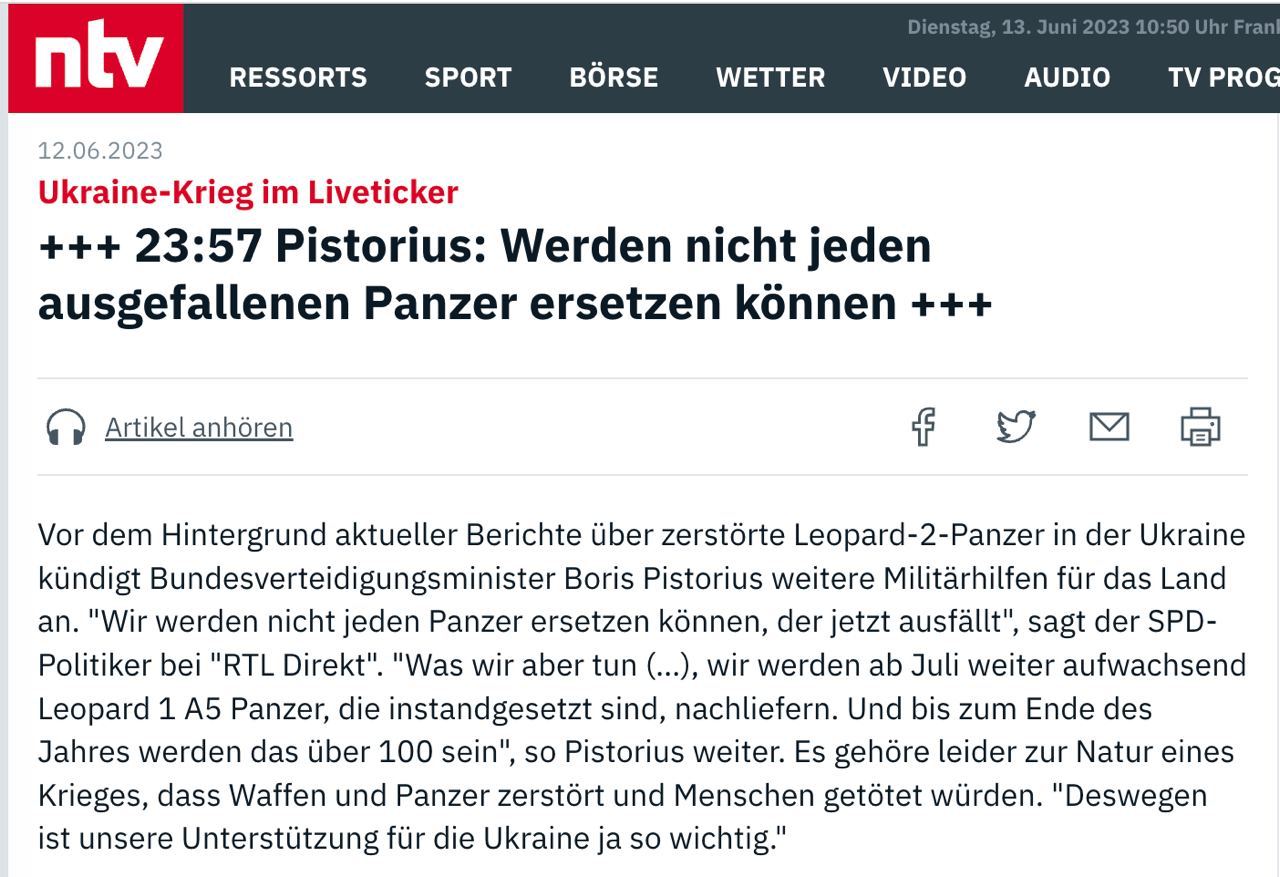 Министр обороны ФРГ Борис Писториус заявил, что Германия не сможет заменить Украине каждый танк, потерянный в ходе наступления.