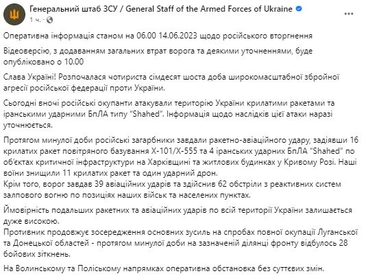 В среду, 14 июня, Генштаб ВСУ обнародовал сводку о ситуации на фронте.