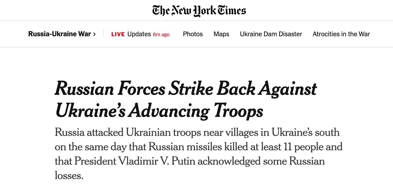"Российская армия наносит ответный удар по наступающим украинским войскам", - с таким заголовком вышел материал в The New York Times.