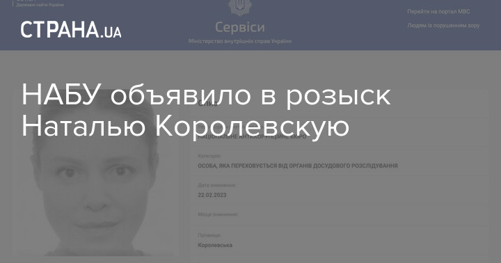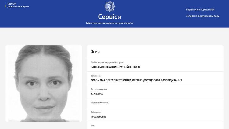 НАБУ объявило в розыск экс-нардепа от ОПЗЖ Наталью Королевскую. Карточка на сайте МВД появилась сегодня.