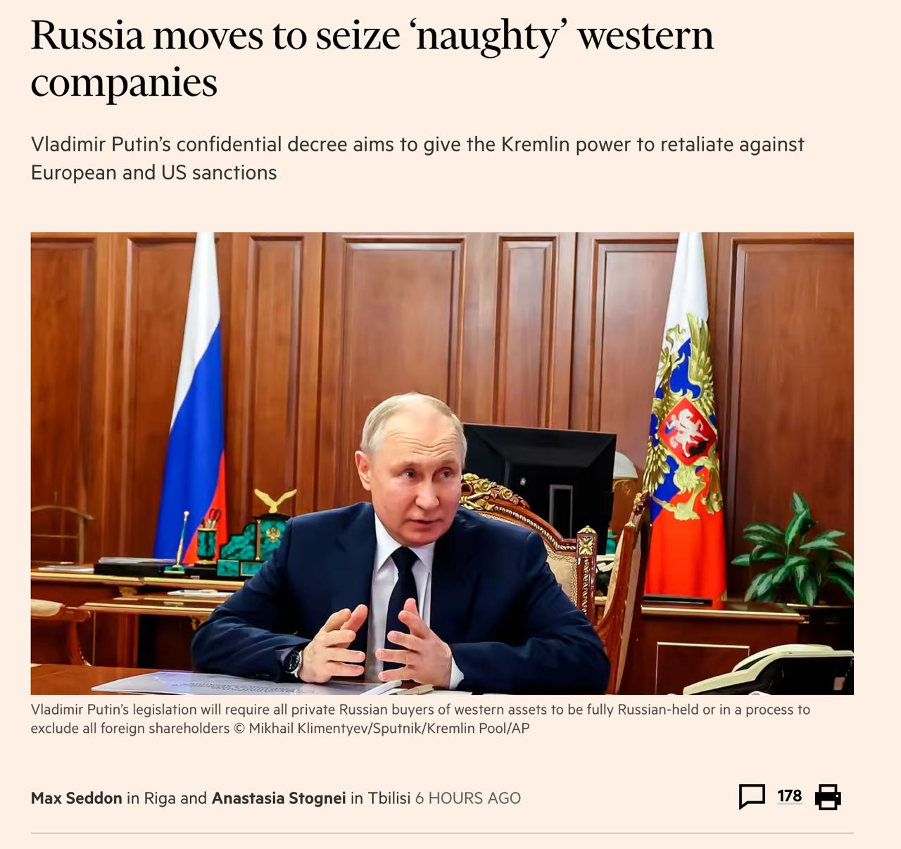 У Путина считают такую стратегию подходящим методом кнута и пряника, направленным на наказание западных стран, захвативших российские активы, и поощрение тех компаний, которые играют по кремлёвским правилам.