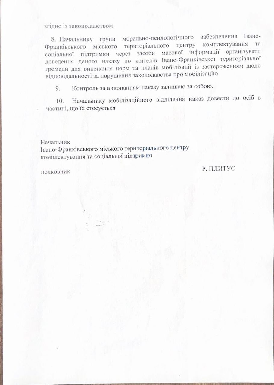 "Всем военнообязанным-мужчинам проживающим (находящимся) на территории Ивано-Франковской территориальной громады явиться в Ивано-Франковский городской территориальный центр комплектования и социальной поддержки в 10-дневный срок с даты опубликования данного приказа", - говорится в документе, изданном 13 июня.