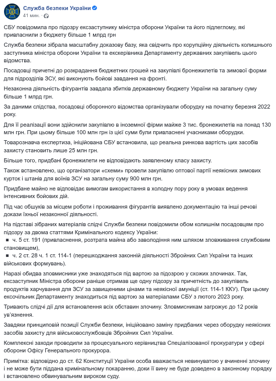 Чиновников подозревают в хищении более миллиарда гривен бюджетных средств на закупке бронежилетов и зимней формы для подразделений ВСУ, воюющих на передовой. Сделка была заключена в начале марта 2022 года, то есть в первые дни вторжения РФ.