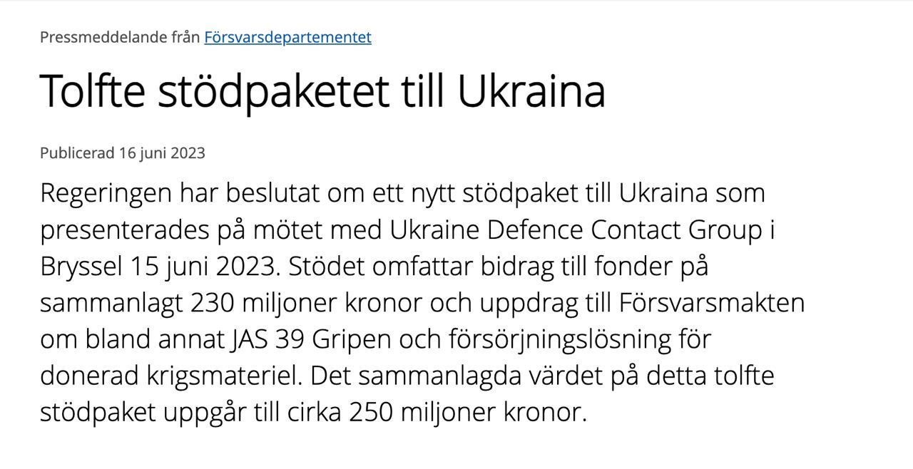 Ранее мы сообщали, что Швеция не сможет передать свои истребители Украине. Зато внесёт около $30 миллионов в Фонд энергоподдержки Украины.