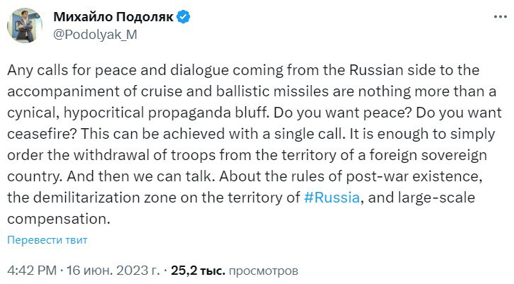 "Любые призывы к миру и диалогу, исходящие с российской стороны под аккомпанемент крылатых и баллистических ракет, не более чем циничный, лицемерный пропагандистский блеф. Вы хотите мира? Вы хотите прекращения огня? Этого можно добиться одним звонком. Достаточно просто отдать приказ о выводе войск с территории иностранного суверенного государства. И тогда мы сможем поговорить. О правилах послевоенного существования, зоне демилитаризации на территории России и крупных компенсациях", – написал Подоляк в соцсети.