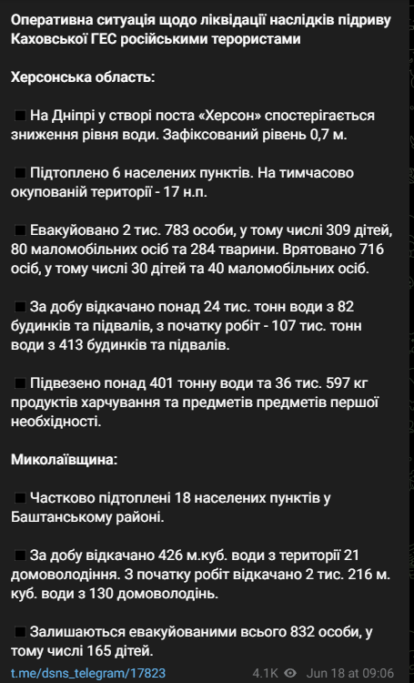 По данным спасателей, из Херсонской области были эвакуированы 2783 человека, в том числе 309 детей, 80 маломобильных лиц и 284 животных. Спасены 716 человек, в том числе 30 детей и 40 маломобильных.