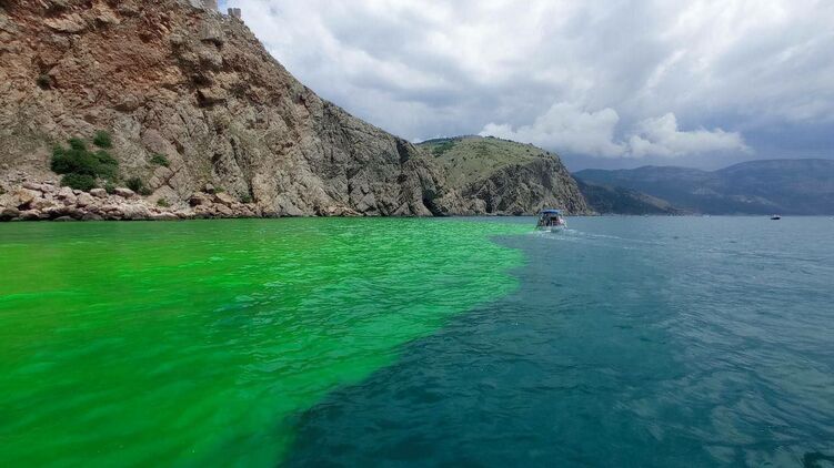 На южном побережье оккупированного Крыма, в Балаклавской бухте вода изменила свой природный цвет, окрасившись в ядовито зеленый цвет.