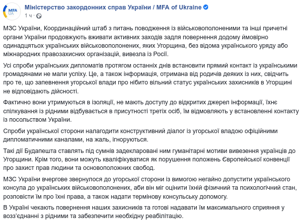 Речь идёт об украинских военнослужащих, выданных из российского плена в Венгрию без какого-либо согласования с Украиной.
