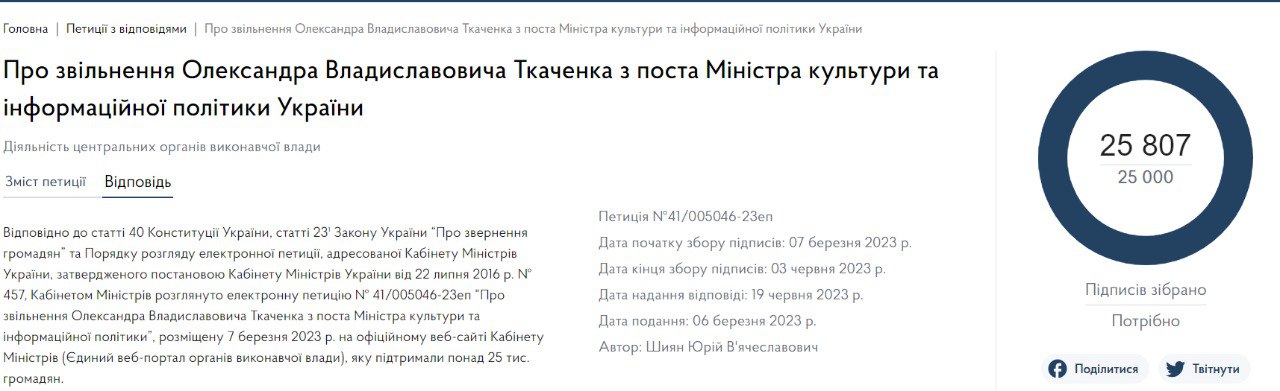 В начале июня мы сообщали, что петиция с призывом уволить Ткаченко на сайте правительства набрала необходимые 25 тысяч голосов.