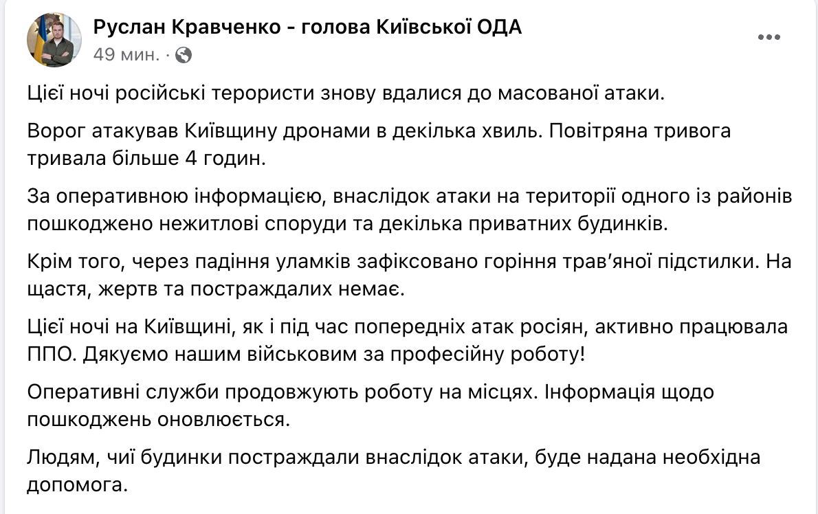 "Враг атаковал Киевщину дронами в несколько волн. Воздушная тревога продолжалась более 4 часов", - написал Кравченко.