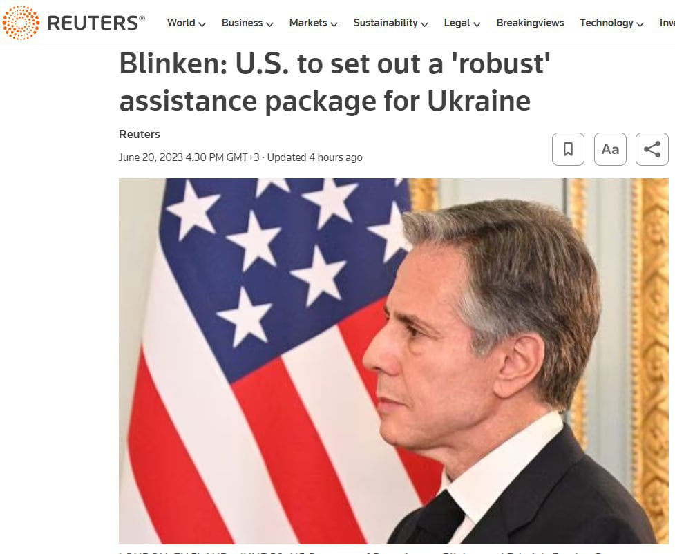 "Президент Байден сказал, что мы будем поддерживать Украину столько, сколько потребуется... Мы продолжим выполнять это обязательство, в том числе с помощью нового крепкого пакета помощи США, о котором я смогу объявить завтра", — заявил Блинкен на брифинге.