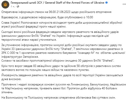 2. За прошедшие сутки российские оккупанты выпустили по Украине 33 иранских дрона, семь ракет С-300, одну крылатую ракету "Искандер-М". Силами ПВО было уничтожено 30 дронов. Кроме того, враг нанес 83 авиационных удара и совершил 58 обстрелов из РСЗО.