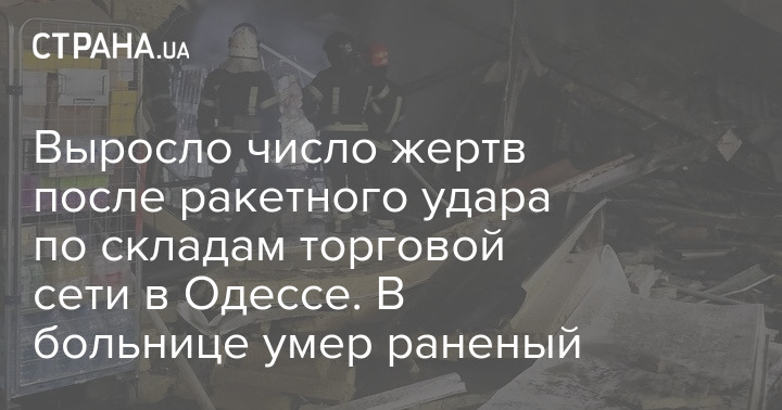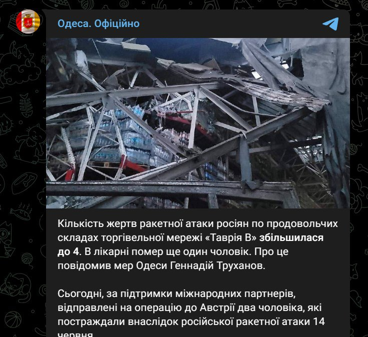 Вследствие удара по складам торговой сети "Таврия Б" в Одессе 14 июня умер еще один человек - его не смогли спасти в больнице. Таким образом число жертв той ракетной атаки выросло до четырех.