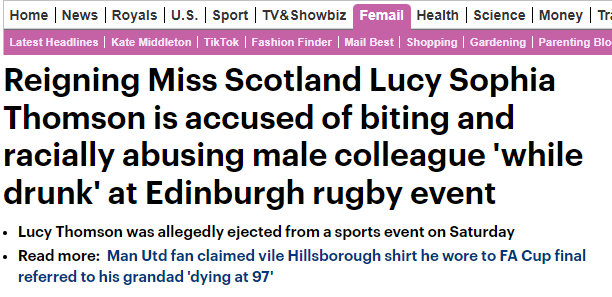 Драка между девушкой и охранником произошла 17 июня на стадионе в Эдинбурге, где проходили соревнования по регби. Очевидцы, которые успели снять инцидент на видео, утверждают, что Томсон пришла пьяной, напала на охранника и публично оскорбила его из-за расовой принадлежности. Некоторые свидетели утверждают, что девушка даже укусила пострадавшего.