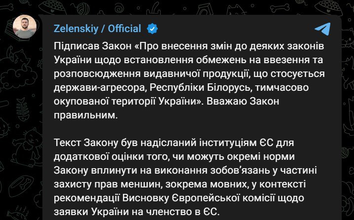Президент Украины Владимир Зеленский подписал закон о запрете ввоза и распространения российской издательской продукции.
