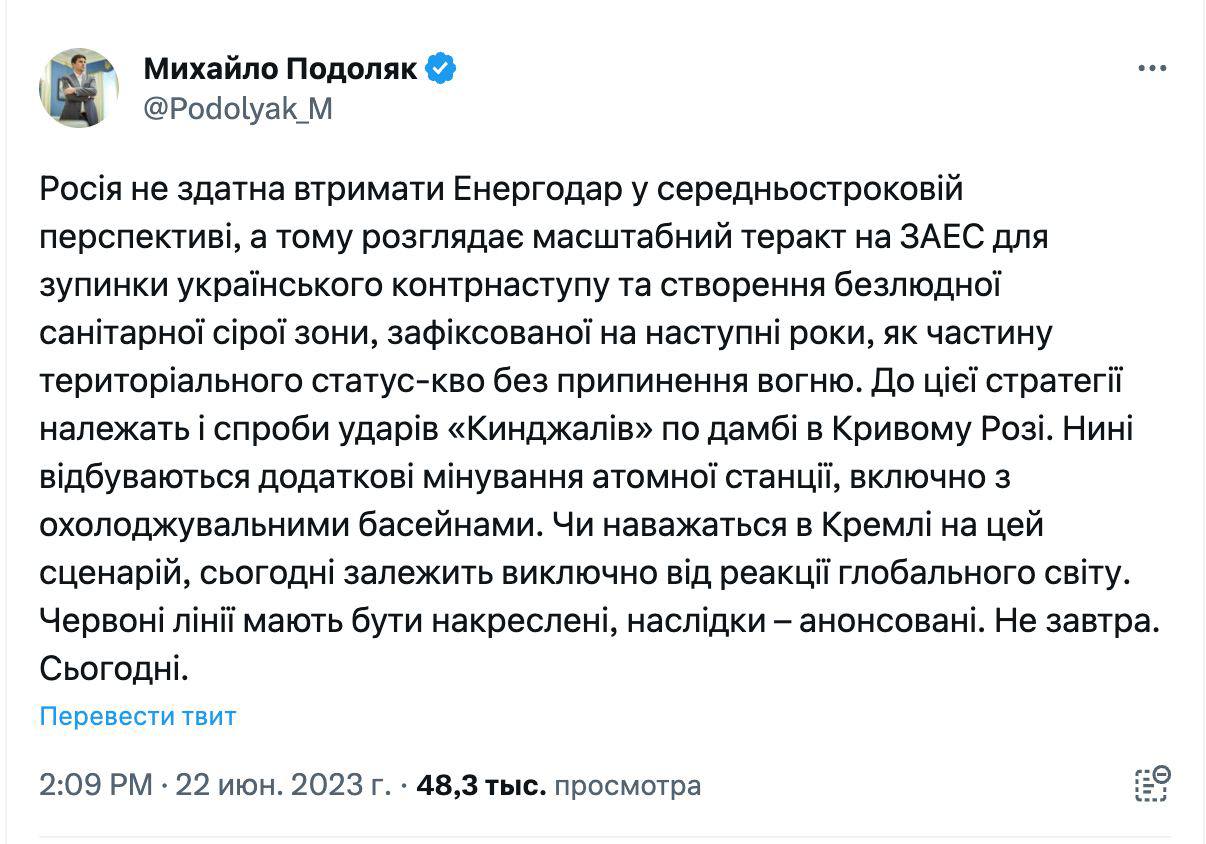 Подоляк добавил, что Россия не способна удержать Энергодар в среднесрочной перспективе.