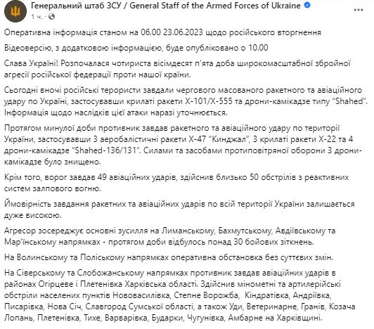 В пятницу, 23 июня, Генштаб ВСУ обнародовал сводку о ситуации на фронте.
