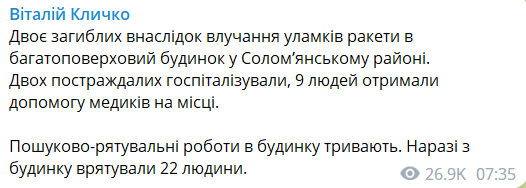 "Двое погибших в результате попадания обломков ракеты в многоэтажное здание в Соломенском районе. Двое пострадавших госпитализированы, 9 человек получили помощь медиков на месте", - сообщил мэр Киева Виталий Кличко.