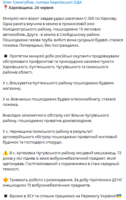 Ночью 24 июня российские войска нанесли удар ракетами С-300 по Харькову. Одна из ракет упала в промышленной зоне Холодногорского района, повредив 10 легковых автомобилей. Вторая ракета попала в землю в Слободском районе, повредив газовую трубу.