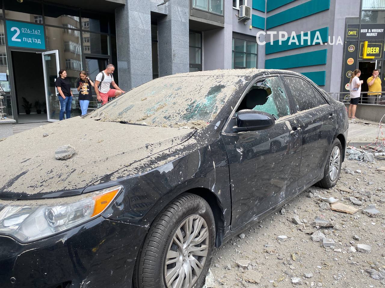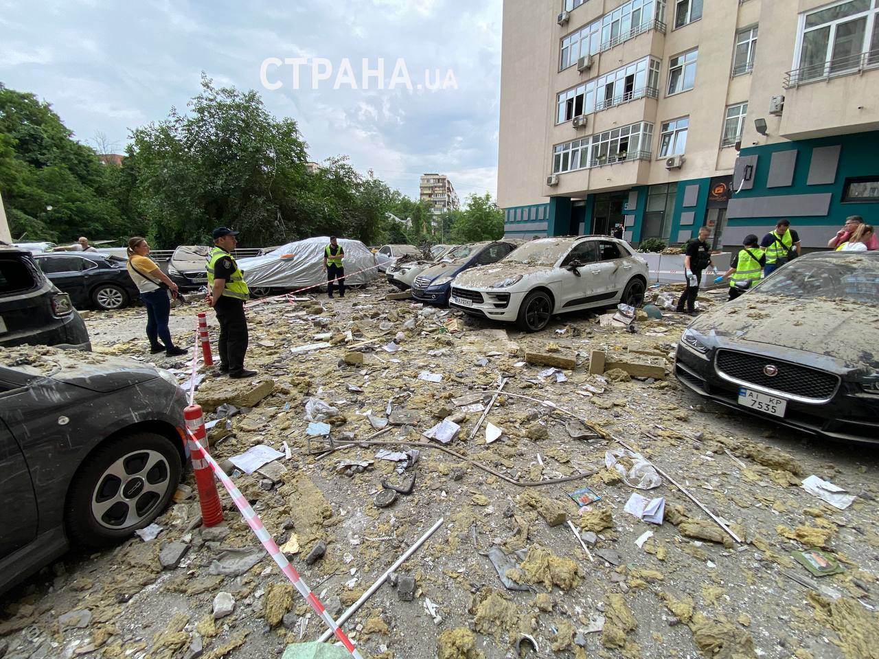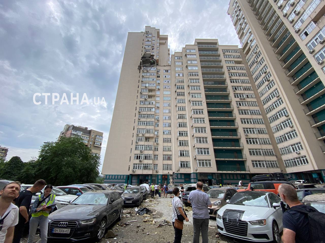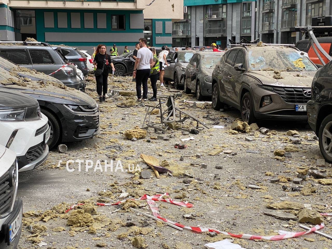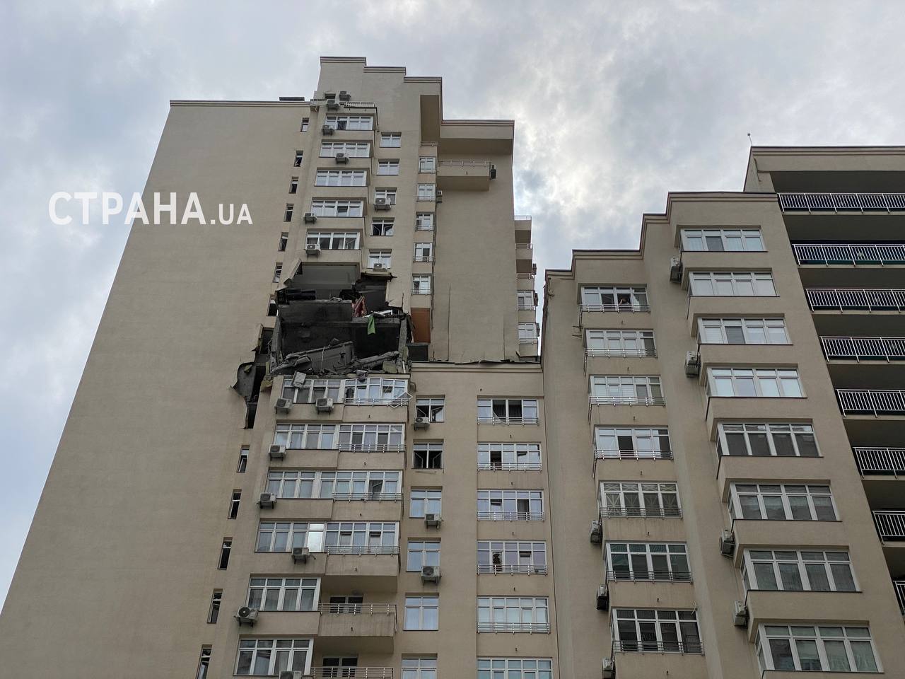 По данным МВД, обломки попали в 25-тиэтажный дом в Соломенском районе. По данным КГГА, частично разрушен 18 этаж, задело также 16-й, 17-й и 19-й этаж здания. Там возник пожар, который сейчас уже потушен.