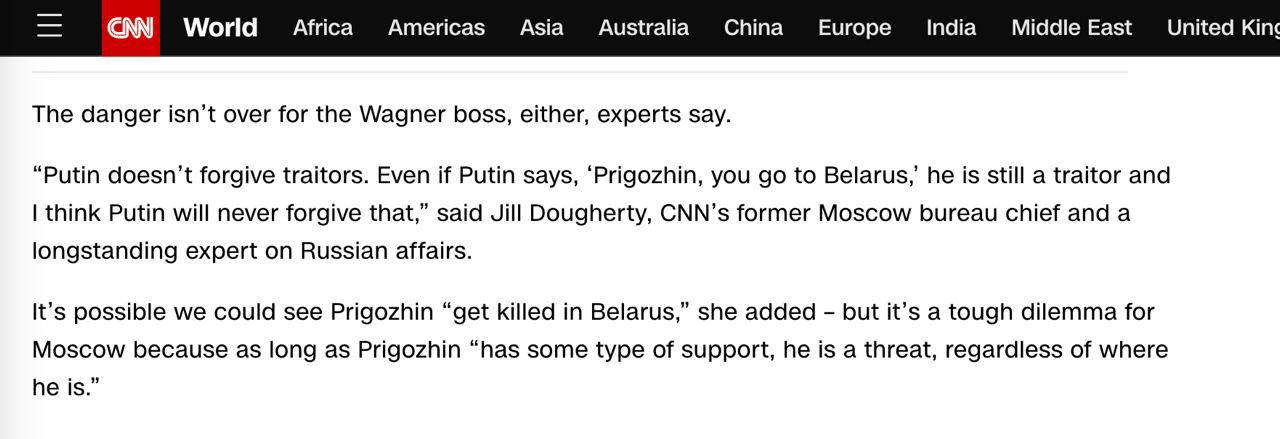 "Путин не прощает предателей. Даже если Путин скажет: "Пригожин, иди в Беларусь", он все равно предатель, и я думаю, что Путин этого никогда не простит", - сказала эксперт CNN.