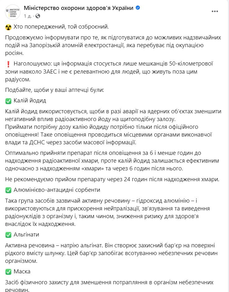 Отмечается, что данная информация касается только жителей 50-километровой зоны вокруг ЗАЭС и не является релевантной для людей, живущих вне этого радиуса.
