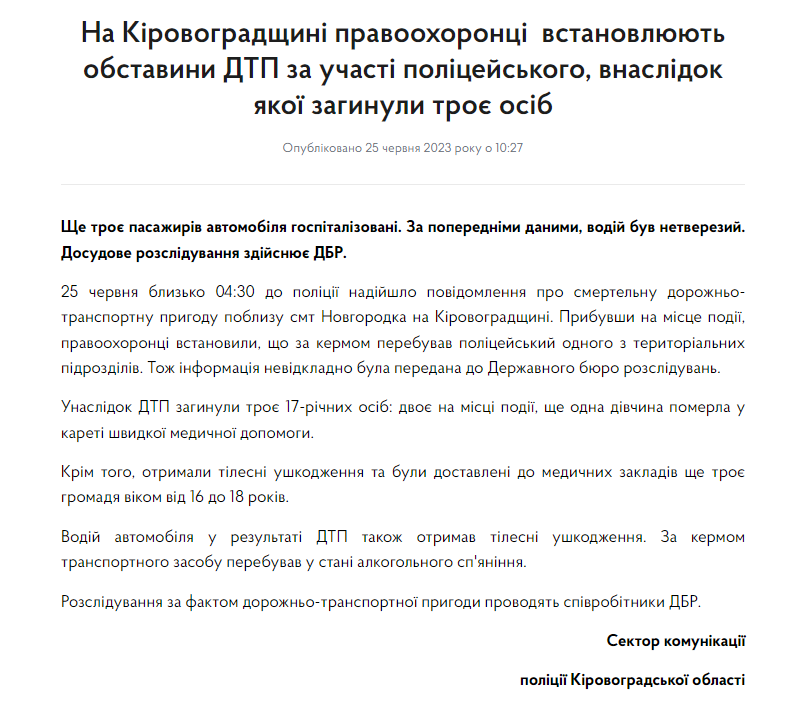 В Кировоградской области в аварии погибли три подростка, за рулем был полицейский