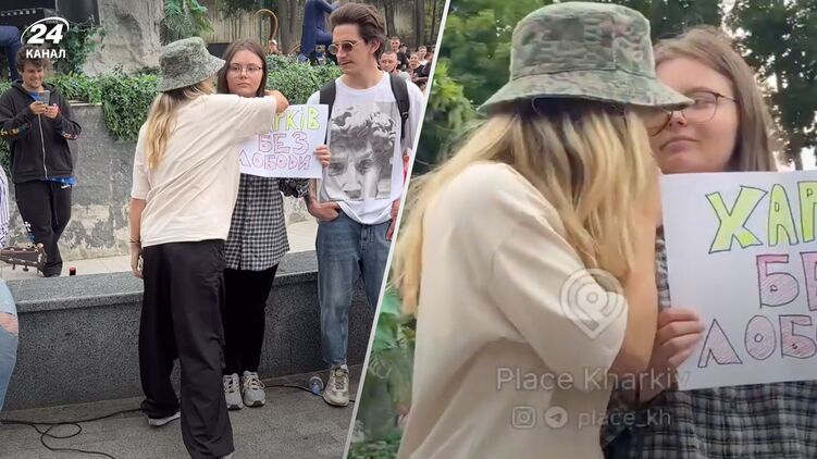 Еще на одном видео Лобода обнимает девушку с плакатом, но это не вызывает никакой реакции у протестующей.