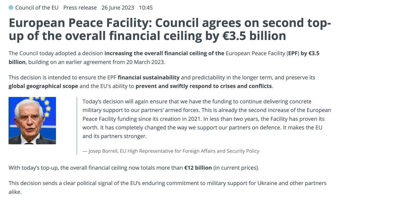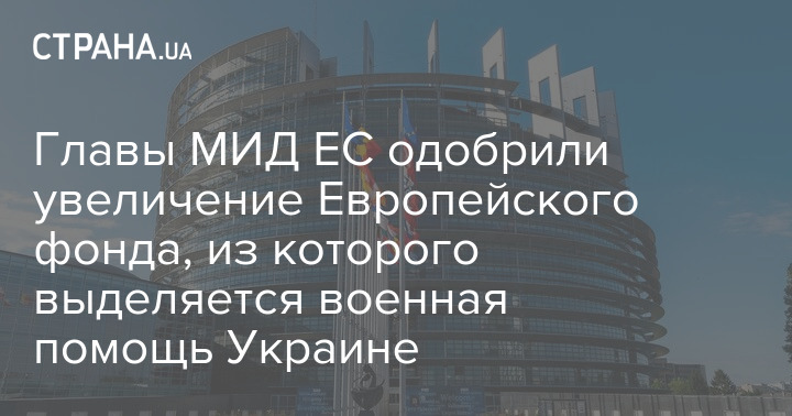 Главы МИД ЕС одобрили увеличение Европейского фонда мира на 3,5 миллиарда евро, через который, в том числе, выделяется военная помощь Украине.