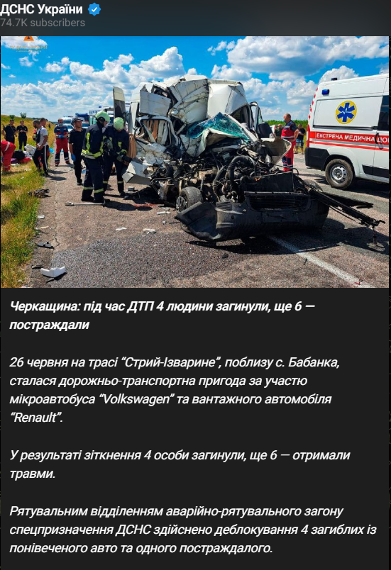 "26 июня на трассе "Стрый-Изварино", вблизи села Бабанка, произошло дорожно-транспортное происшествие с участием микроавтобуса Volkswagen и грузового автомобиля Renault. В результате столкновения 4 человека погибли, еще 6 получили травмы", - говориться в сообщении.