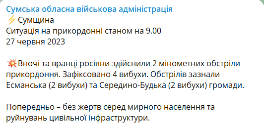 Ночью и утром россияне совершили минометные обстрелы приграничных населенных пунктов в Сумской области. Под обстрел попали Эсманская и Середино-Будская громады.