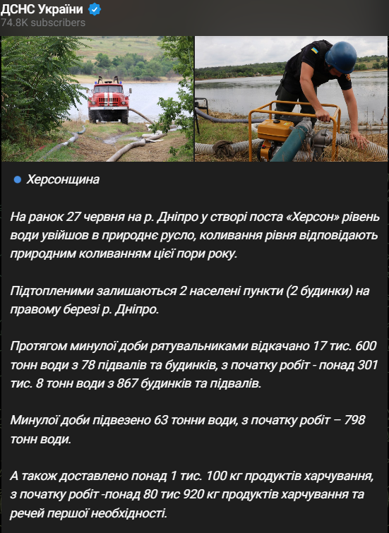 По состоянию на утро 27 июня Днепр в Херсоне вошел в природное русло после затопления, колебания уровня воды соответствуют естественным колебаниям этого времени года.