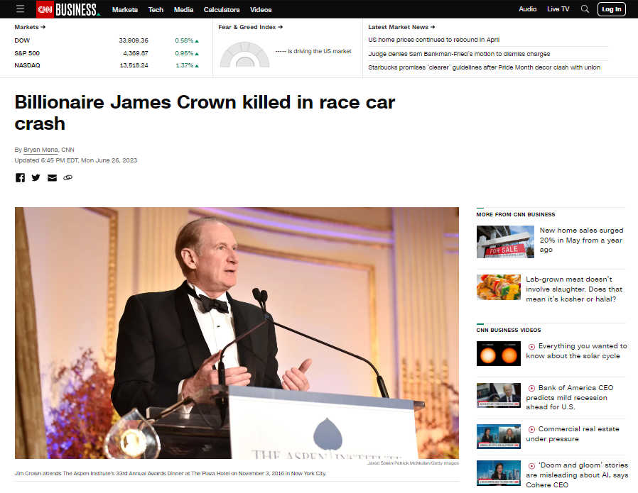 Еще один миллиардер погиб в погоне за экстримом. Американский миллиардер, член совета директоров JPMorgan Chase и глава инвестиционной компании Джеймс Краун погиб в аварии на гоночной трассе. В этот день ему исполнилось 70 лет.
