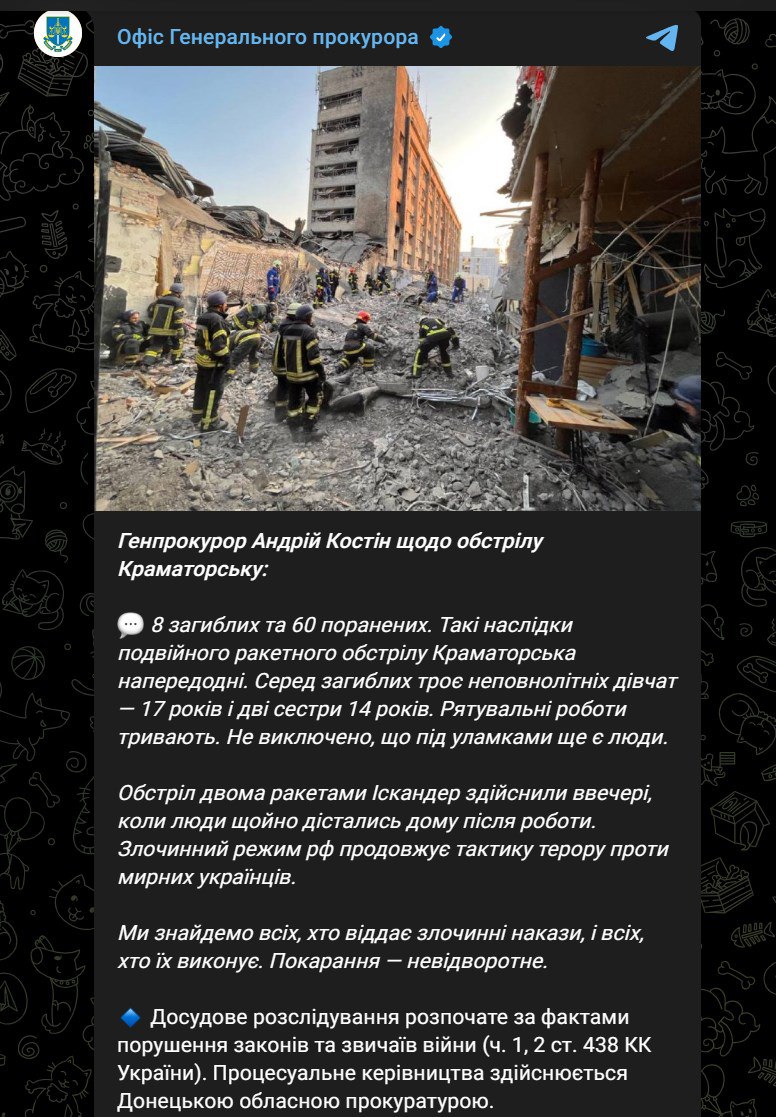 "8 погибших и 60 раненых. Таковы последствия двойного ракетного обстрела Краматорска накануне. Среди погибших три несовершеннолетних девушек - одна 17 лет и две сестры 14 лет. Спасательные работы продолжаются. Не исключено, что под обломками есть еще люди", - говорится в сообщении.