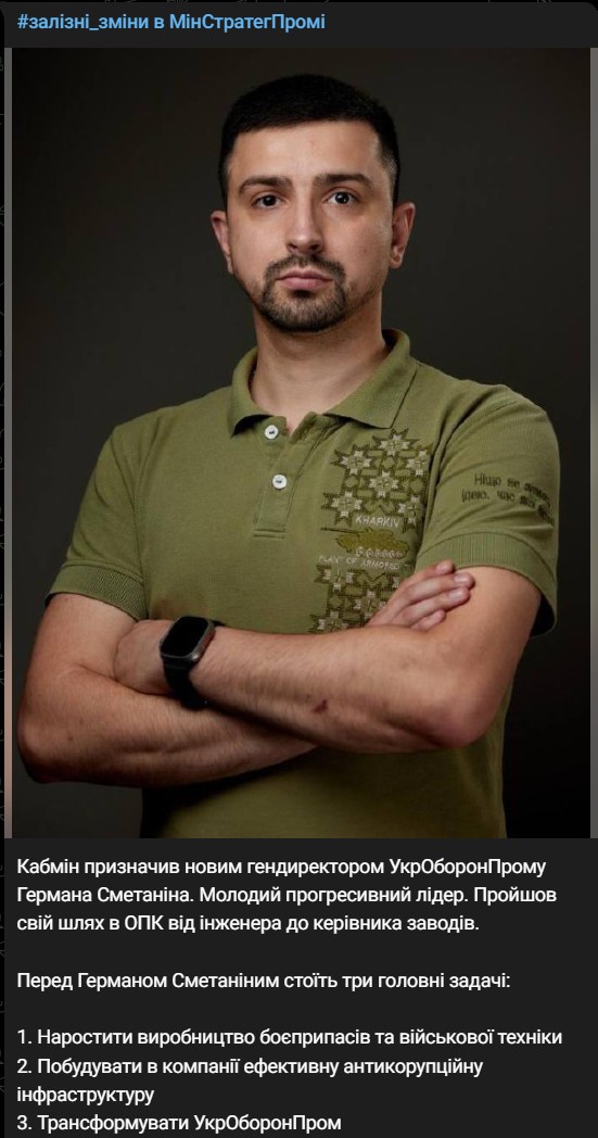 "Кабмин назначил новым гендиректором "Укроборонпром" Германа Сметанина. Молодой прогрессивный лидер. Прошел свой путь в ОПК от инженера до руководителя заводов", - написал Камышин.