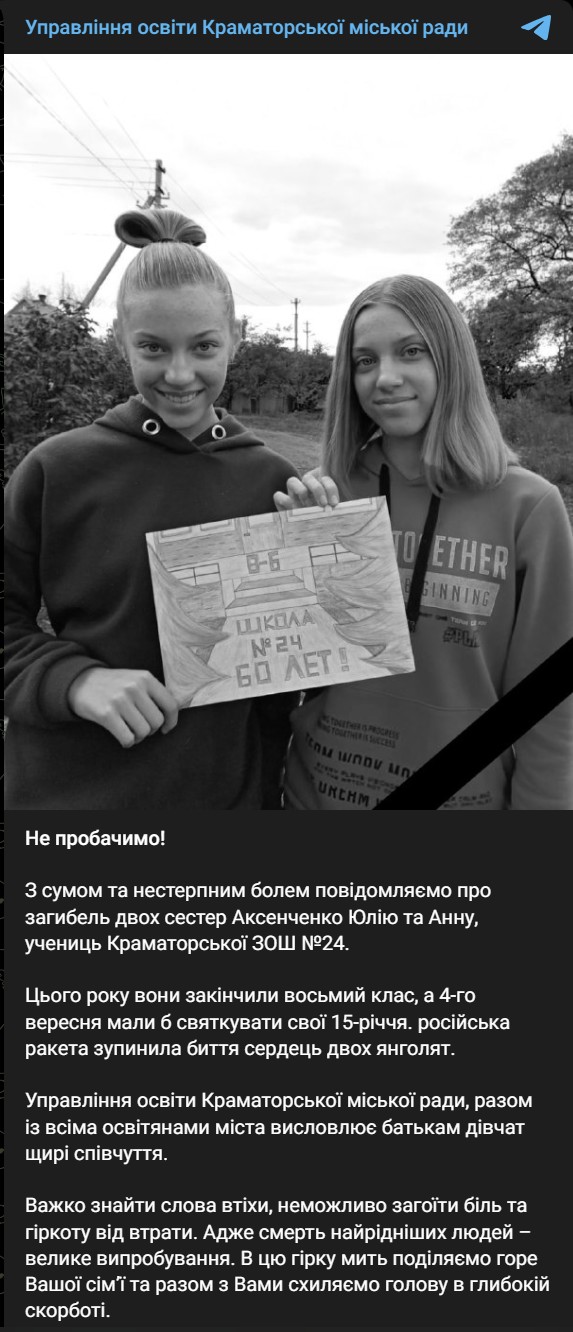Россия убила двух сестер во время ракетного удара по Краматорску. Фото: Telegram
