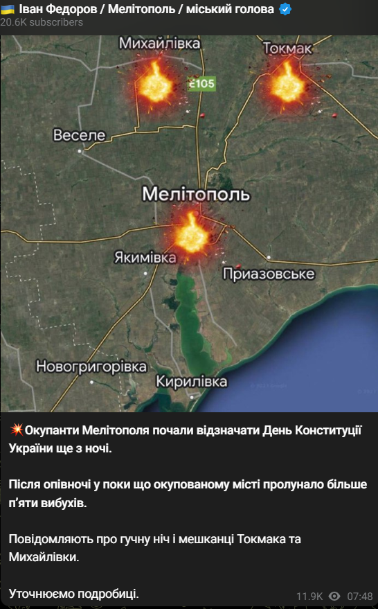 Мэр Мелитополя Иван Федоров говорит, что взрывы в городе, а также соседних Токмаке и Михайловке звучали всю ночь.