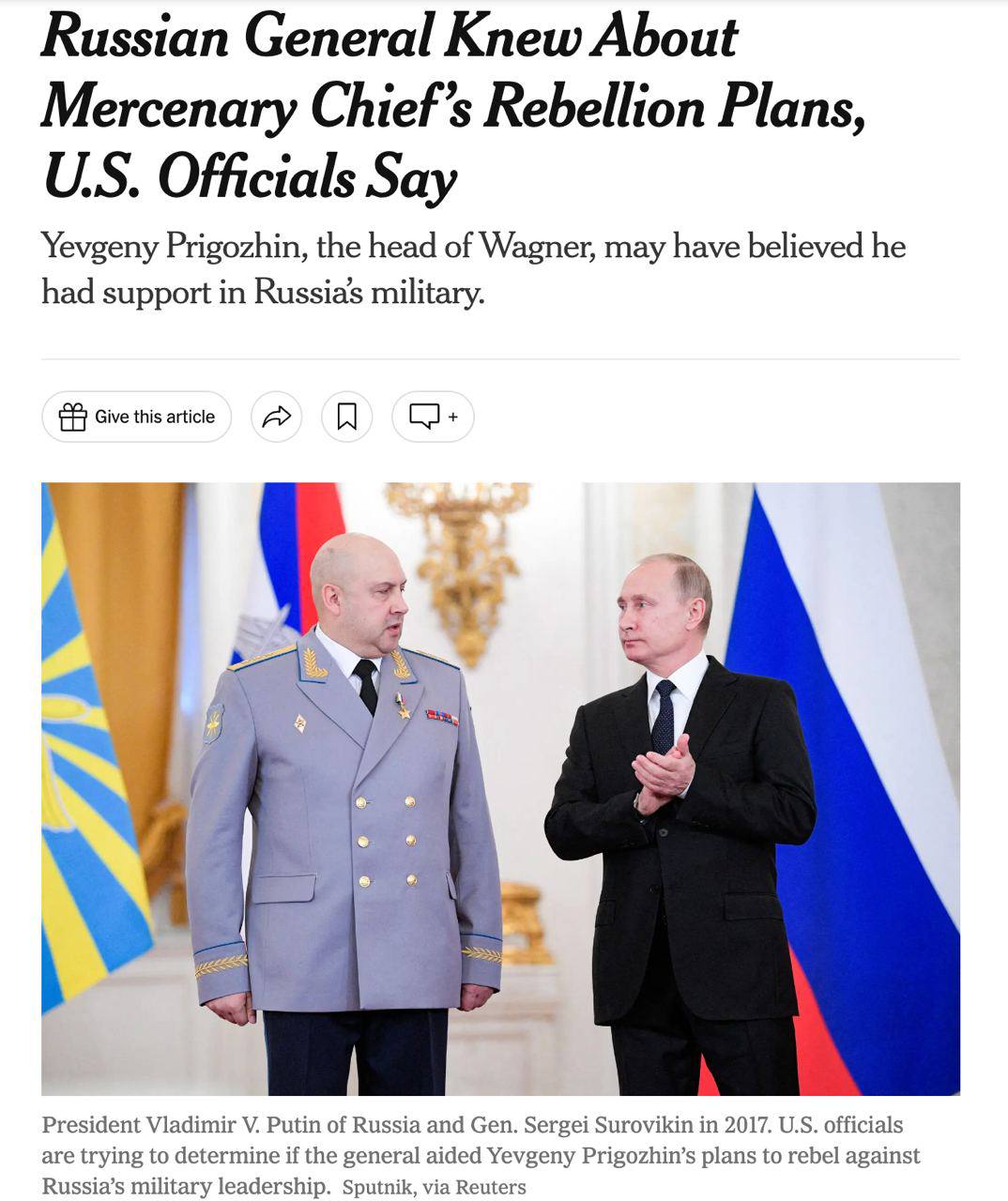 The New York Times пишет, что российский генерал Суровикин мог знать о планах "Вагнера" устроить мятеж
