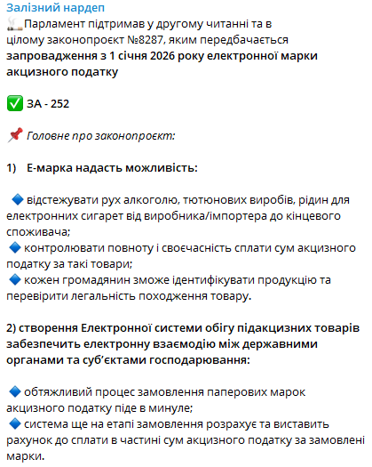 Верховная Рада поддержала запуск электронной марки акцизного налога с 1 января 2026 года.