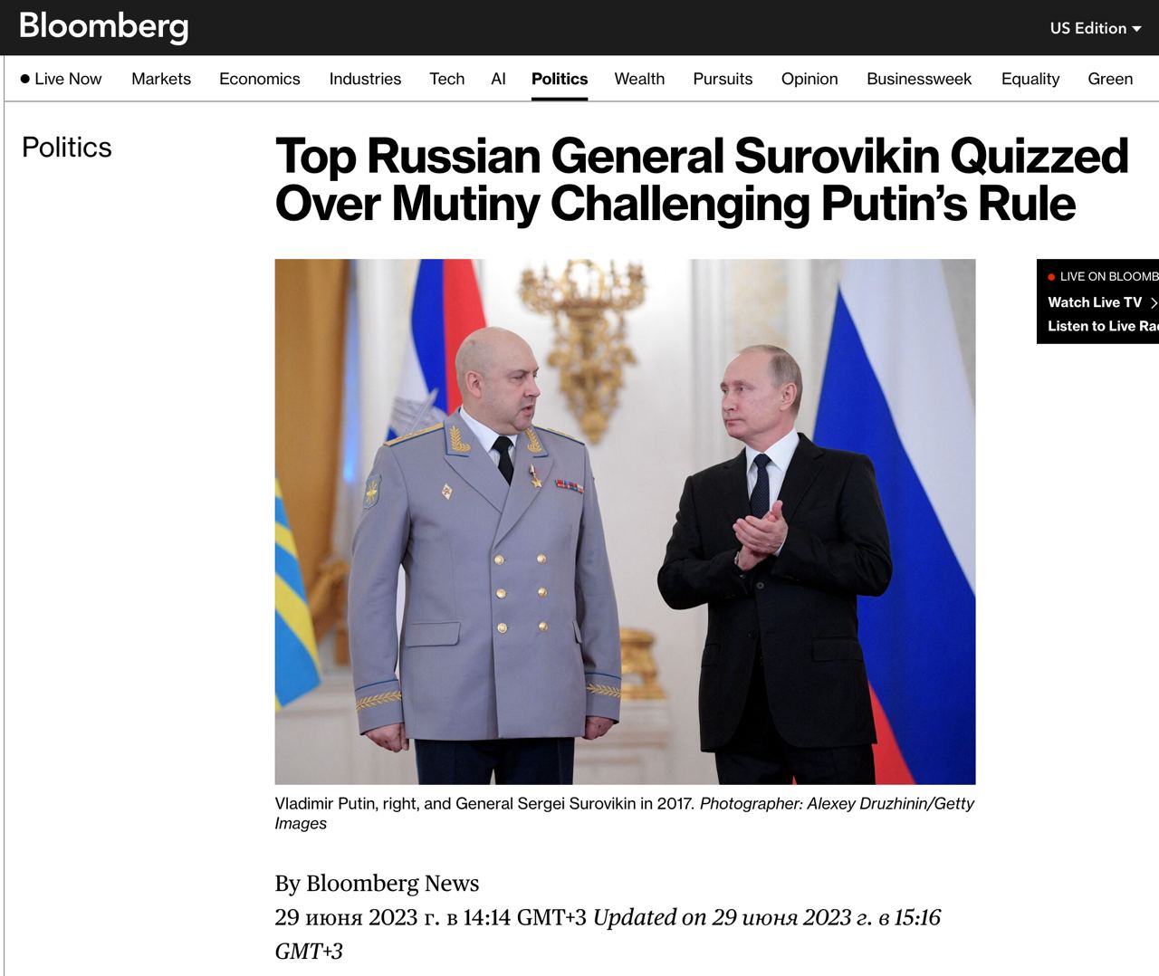 Вскоре после выхода материала Financial Times агентство Bloomberg тоже сообщило о задержании Суровикина. По данным источников издания, военная прокуратура допрашивала его в течение нескольких дней. Bloomberg пишет, что сейчас Суровикин содержится в "одном месте", но не в тюрьме.