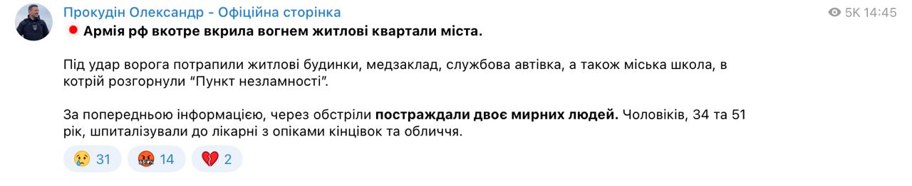 Об этом сообщает в своем телеграм-канале глава Херсонской ОВА Александр Прокудин.