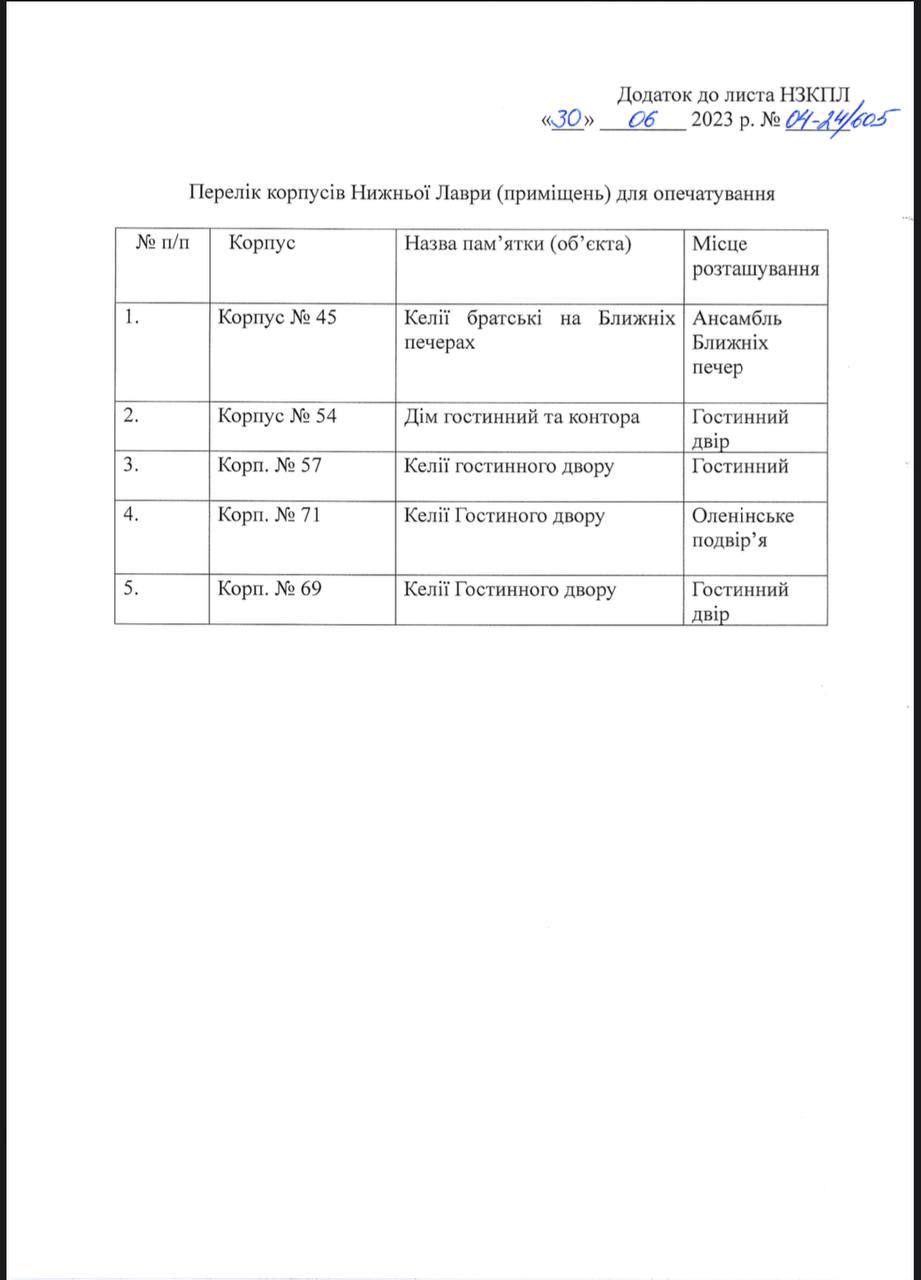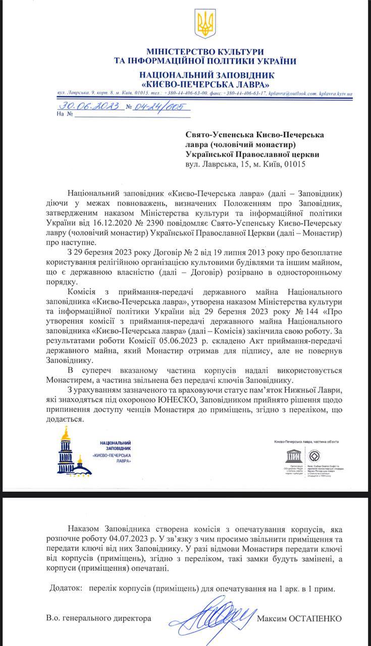 "Заповедником принято решение о прекращении доступа монахов монастыря к помещениям. Приказом создана комиссия по опечатыванию корпусов, которая начнет работу 04.07.2023. В связи с этим просим освободить помещения и передать ключи от них заповеднику", - говорится в документе в адрес УПЦ, который Чекман опубликовал в своем телеграм-канале.