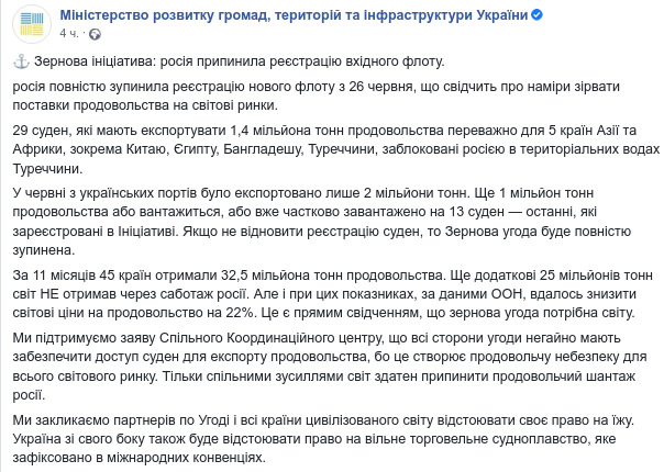 "РФ полностью остановила регистрацию нового флота с 26 июня, что свидетельствует о её намерениях сорвать поставки продовольствия на мировые рынки. 29 судов, которые должны экспортировать 1,4 миллиона тонн продовольствия преимущественно для пяти стран Азии и Африки, включая Китай, Египет, Бангладеш, Турцию, заблокированы Россией в территориальных водах Турции", - говорится в сообщении.
