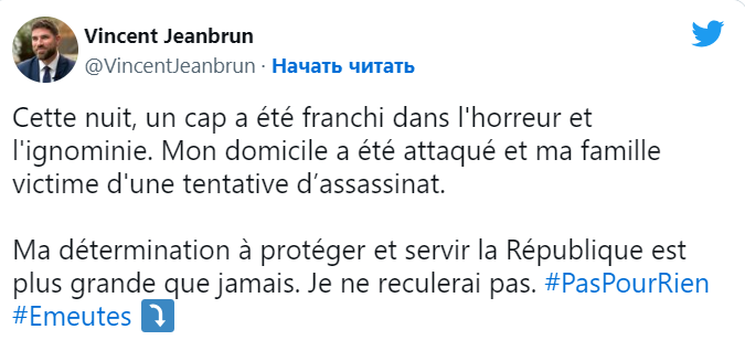 Мэр Л'А-ле-Роз Винсент Жанбрун написал в Твиттере, что протестующие "протаранили машиной" его дом, прежде чем "поджечь".