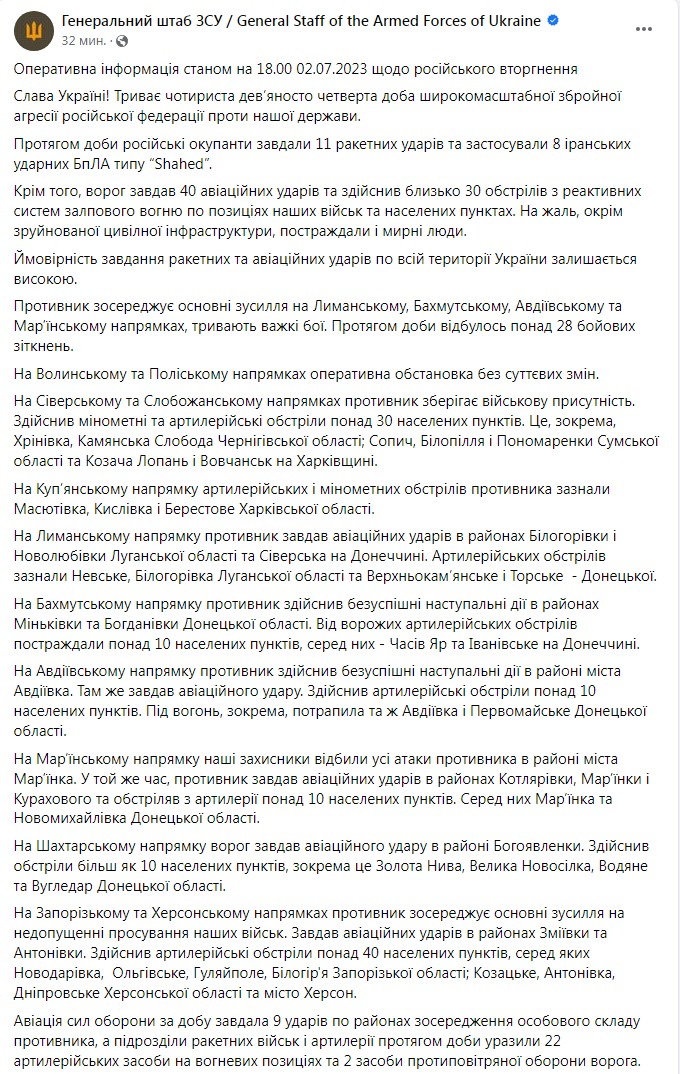 Генштаб ВСУ опубликовал оперативную информацию о российском вторжении по состоянию на 18:00 2 июля.