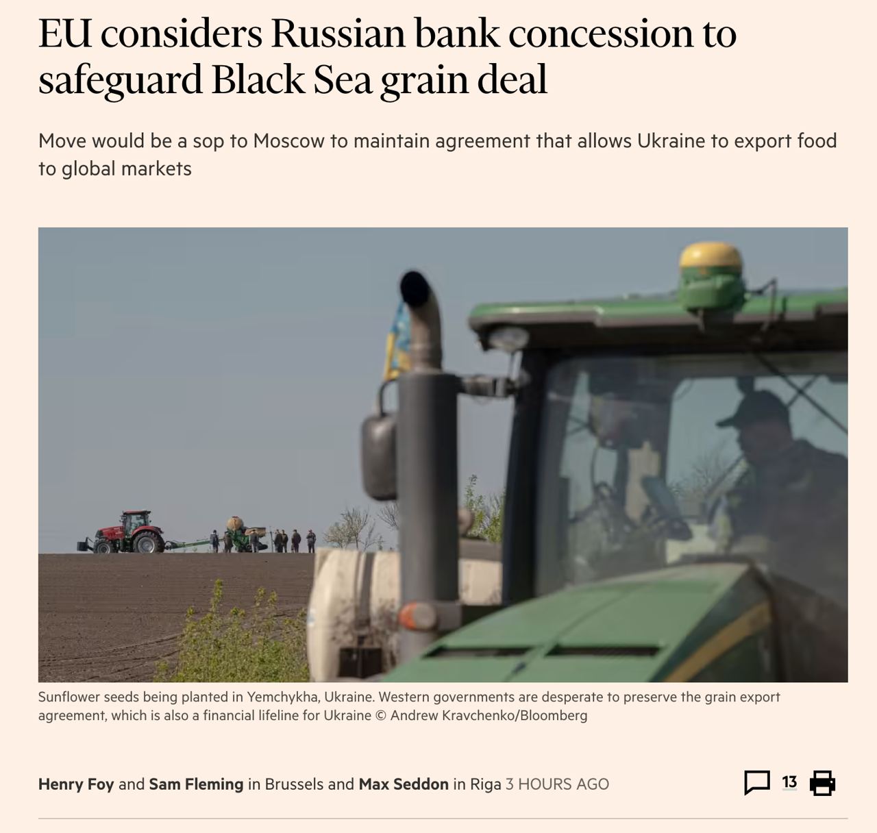 Он обсуждался лидерами ЕС на саммите в Брюсселе на прошлой неделе. По словам источников издания, эта идея была воспринята как «наименее худший вариант» для продления зерновой сделки, которая "является финансовым спасательным кругом для Украины".