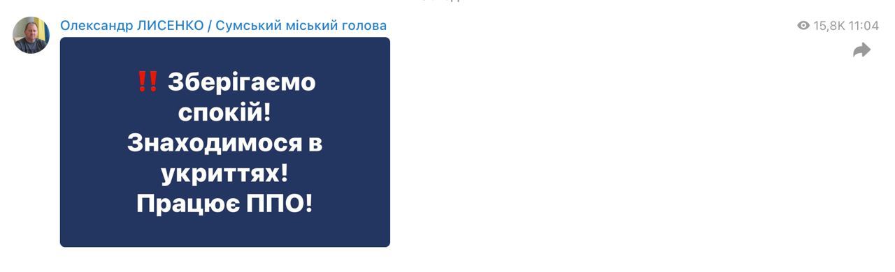 15.10 В Сумской области есть угроза повторного удара дронами, предупреждают Воздушные силы.