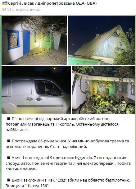 07.33 Поздним вечером под вражеский артиллерийский огонь попали Марганец и Никополь.